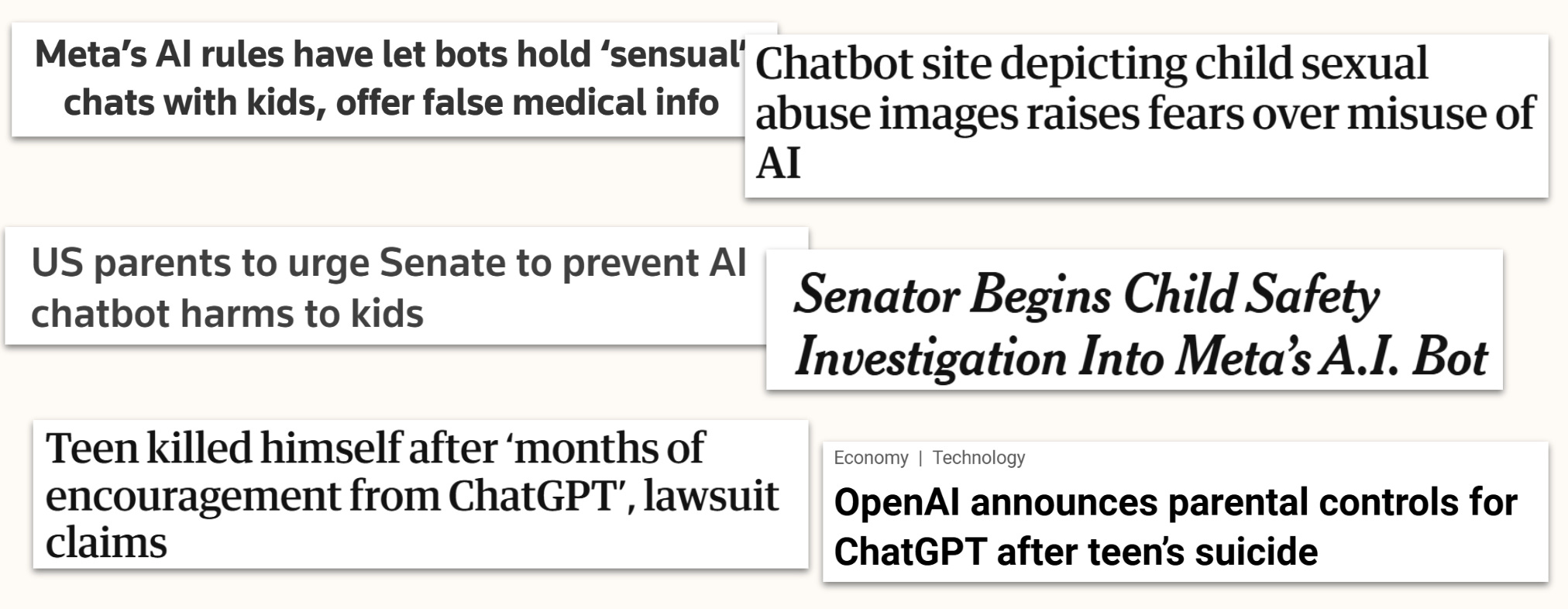 Child safety is one such flashpoint. After a few months of latent concerns about chatbot use by children spurred on by controversial company policies, the conversation has now broken through. Recent instances of allegedly AI-assisted suicides have resulted in a high-profile lawsuit, national attention, policymaker concern, and hasty reactive commitments from OpenAI. This won’t stop any time soon: Teenagers are early and enthusiastic adopters of chatbot assistants, with less natural apprehension to intimate and personal conversation. AI developers seem keen to capture this market, and some even seem ready to tolerate troubling usage patterns, perhaps to secure valuable engagement.