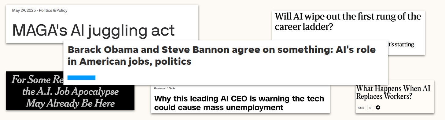 A political window is opening up: policymakers are waking up to AI-driven job market disruption. A critical mass of headlines, studies and well-placed arguments seems to have gotten the attention of mainstream political players – culminating in a strange confluence as both Barack Obama and Steve Bannon have predicted that AI jobs loss will be a major political topic soon. For the purpose of this post, I’ll go with their assumption, too — and examine what the resulting political constellation means for the next months of AI policy.