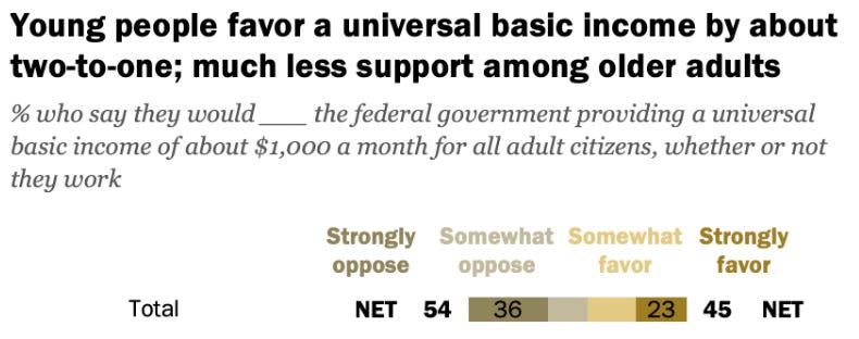Universal Basic Compute (UBC) is a newer spin on basic provisions, advanced prominently by OpenAI CEO Sam Altman after disappointing empirical and political results of his previous UBI advocacy. UBC solves some of the problems with UBI: compute might be something like productive capital, and an enduring compute share that you can leverage to maintain relevance seems like a more durable solution. Or you can just sell it, and then it’s basically UBI. There is plenty of technical debate to be had on this that goes beyond this post, but it definitely faces political shortcomings, mainly: No sizable constituency in the world currently thinks ‘compute’ is something particularly useful to them, so the prospect of receiving UBC instead of a job will not play well as a political platform right now. Even if you frame UBC as ‘basic access to powerful AI’, it might not play very well: It takes a lot of imagination to conceive of the world in which that is enough, i.e. one in which prices of basic goods collapse and powerful AI can easily be wielded to achieve marginal profits. With UBI, at least you’re giving people money, which they know they want.