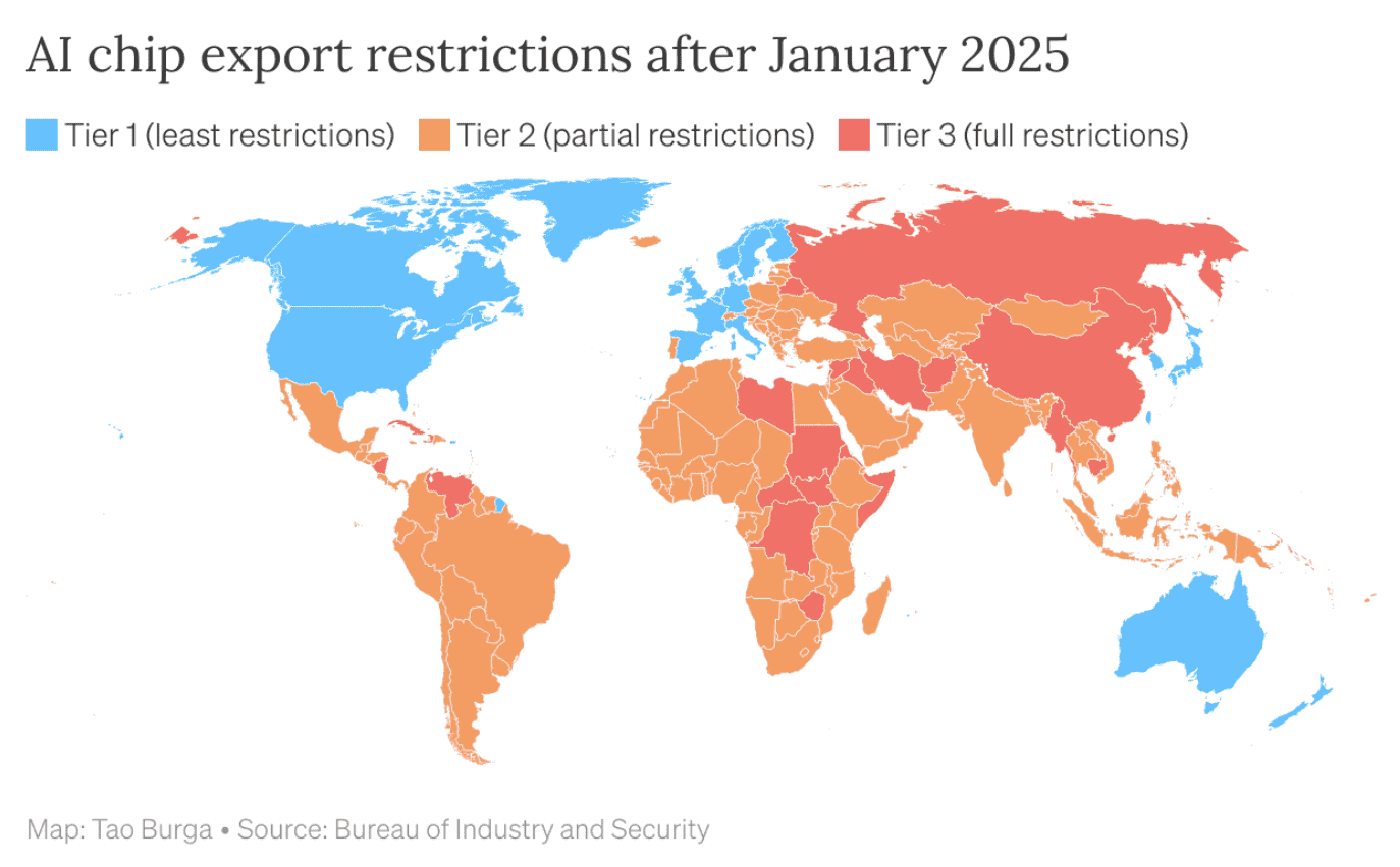 When the US last tried to run the restriction-heavy playbook, only countries in blue could import large amounts of frontier chips. This framework has since been rescinded, but no one should be too sure of their odds in the next round. (BIS / IfP)