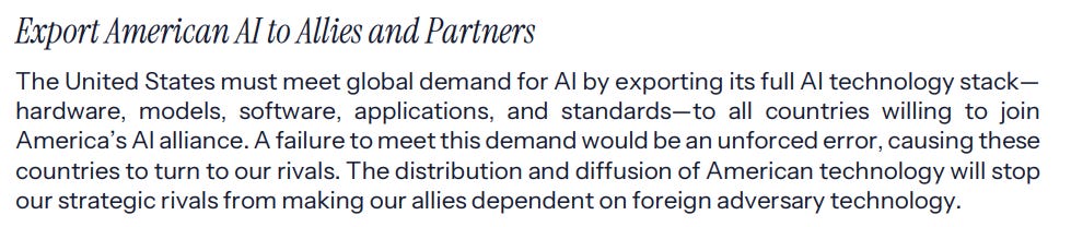 Winning the AI race may mean establishing economic instead of military supremacy: more like racing to secure oil rather than building nuclear weapons. This is a mercantilist view of the AI race’s strategic dimension, approaching AI as a central resource that determines the flow of the global economy (as oil does now). In this view, a securitized environment makes much less sense: you want to sell as much AI as possible, thereby consolidating resources to build out your broader military capability. If you’re planning to achieve economic dominance over the other side by selling AI, controls are less attractive. This notion, underpinned by broader cultural considerations, seems to motivate the geopolitical contributions of the AI Action Plan, which provides a blueprint for a market-share oriented view of competing with China on AI.