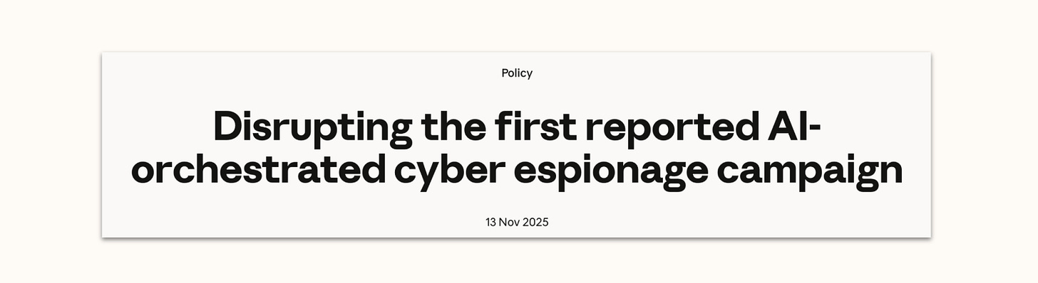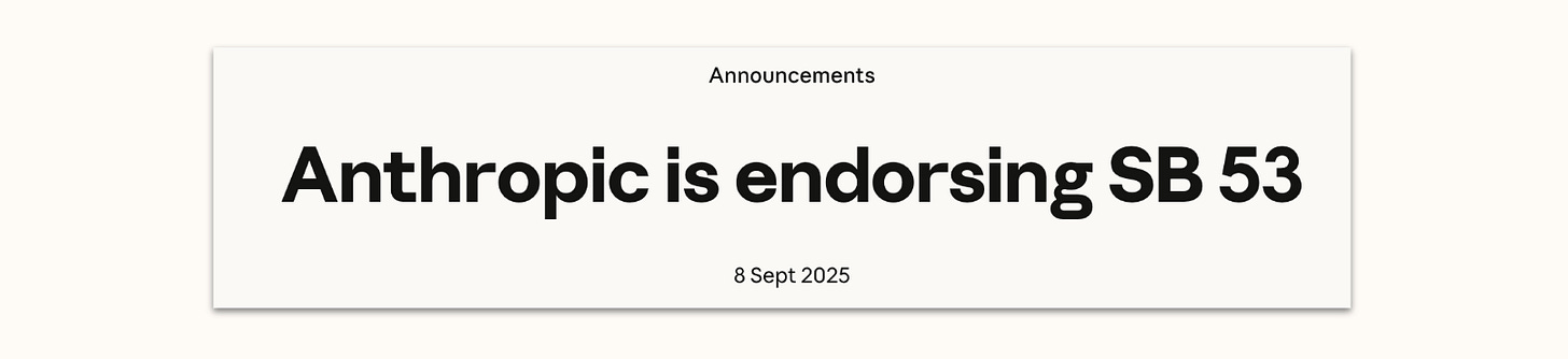 In the last few weeks, some fault lines have started to show. In quick succession, three separate events left some with an impression of agenda-driven behavior, incurring public attacks on Anthropic’s broader credibility. First, Anthropic provided industry support for SB-53, a California law mandating increased transparency from frontier developers. Second, co-founder Jack Clark spoke to a broader political strategy: create transparency into frontier systems, then leverage the findings for further policy asks. Third, Anthropic released detailed information on a cyber espionage campaign conducted through Claude Code.