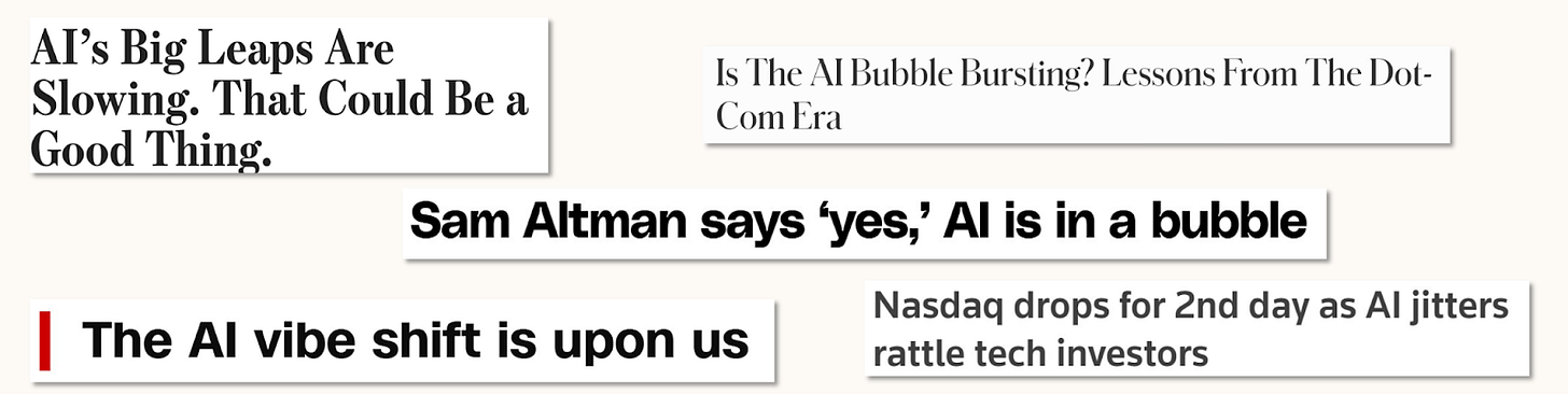 These points together make for a clear story that requires no pessimism in AI progress: As the future of AI systems becomes clearer, some specific AI investments turn out to be untenable. Resulting market corrections spiral by swaying vibe-based public and political perceptions and routing nervous investors, creating the public perception of ‘the AI bubble having burst’.