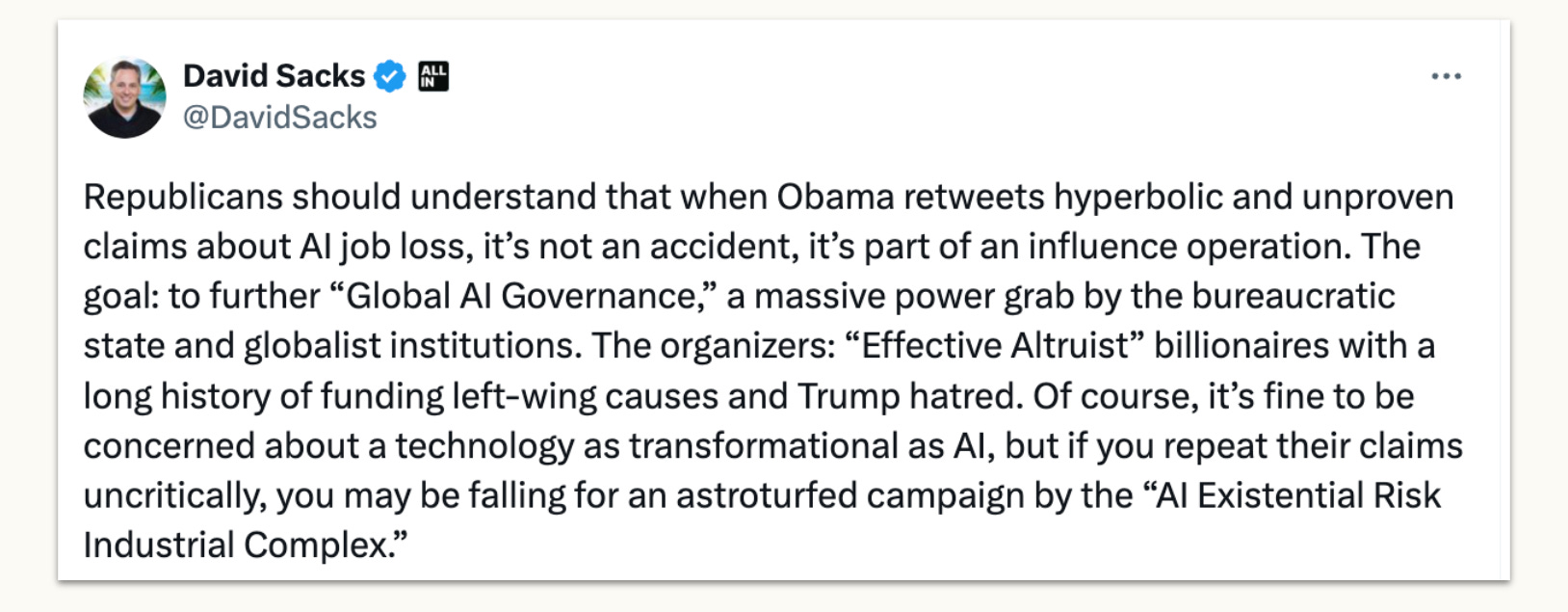 If that episode had been preceded by movement-building efforts in the populist right, I’m not sure the popular support would have had the same weight. Public asks could have been easily identified as being driven by groups with agendas, reducing their credibility and organic appearance. Supporters of the moratorium could have pointed at incubation efforts to discredit this support; noting that waves of calls could be linked to.1 Even as it stands right now, senior administration officials are keeping a watchful eye on AI safety funding streams and how they relate to policy advocacy, readily dismissing much input that can be linked to major funders in the safety space. That dismissal can quickly extend to *all* public support once incubation efforts inevitably become public. Soon, even organic support for AI regulation that would also have existed otherwise will be painted with the same brush, reducing its credibility in the eyes of decisionmakers and ultimately hurting political leverage.