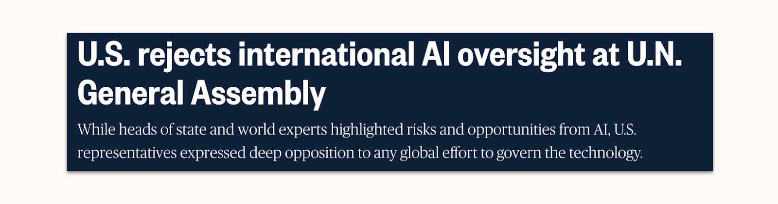 International policy fares even worse. I’ve written at length about international policy attempts up to last year, which leaves me to discuss the more recent call for Red Lines at the UN. While safety advocates view this as an achievement, it strikes me that most powerful decisionmakers on AI haven’t even heard of it. For good reason: the UN—whether as a body or a collection of countries—has no real power it can exert on an issue if a major power doesn’t want it to. Safety advocates know this, but some view the Red Lines being in place as valuable nevertheless: once political salience arrives, they argue, the Red Lines provide a framework to hold onto. I don’t have much new to say on this – I see no way the US government lets any other country dictate what it does on AI. It’s too polarised an issue, too easy a domestic political win, and too much of a strategic imperative to exact absolute sovereignty over domestic development. A similar fate befalls the call for international prohibition of superintelligence: in both cases the burden of proof is on the safetyists to explain how this ever happens.