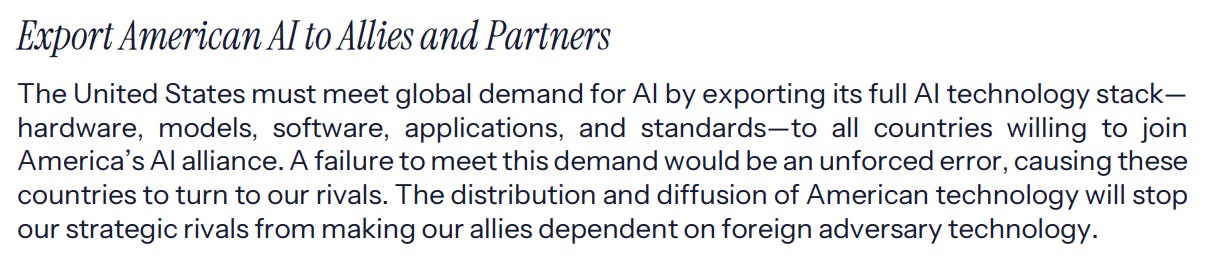 First and fundamentally, the administration aggressively aims at global market share. I think this has a dual purpose beyond the simple mercantilist upshot of selling things at a good price. First it’s culturally motivated: If your AI models populate the world, it is your companies and thereby your domestic oversight that affect a lot of global information flow. If you’re so inclined, you can nudge what the world knows, thinks and believes through domestic regulation – or at least prevent your adversaries from doing the same. But second, it’s about securing market share to capitalise on later: If US AI exports were difficult to attain and expensive, the competing Chinese exports – especially open-source models – would eat into US market share now. That would be an export issue now, and also make it more attractive to buyers to upgrade to more advanced Chinese systems in the future rather than make the swap to the US stack.